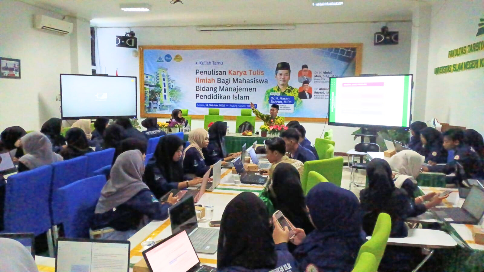 Media Center FTIK - Program Studi S1 Manajemen Pendidikan Islam (MPI) UIN KHAS Jember kembali menunjukkan komitmennya dalam membangun tradisi akademik yang produktif dan inovatif melalui penyelenggaraan Kuliah Tamu bertema “Penulisan Karya Tulis Ilmiah”, yang berfokus pada praktik penulisan artikel ilmiah. Kegiatan yang dilaksanakan di Ruang Rapat Lantai 2 Gedung Fakultas Tarbiyah dan Ilmu Keguruan (FTIK) pada hari Selasa tanggal 14 Oktober 2025 ini diikuti oleh 50 mahasiswa dari semester 3 dan 5, dengan menghadirkan Dr. Hasan Bahrun, M.Pd., pengelola Jurnal Al-Tanzim Universitas Nurul Jadid, sebagai narasumber utama.
